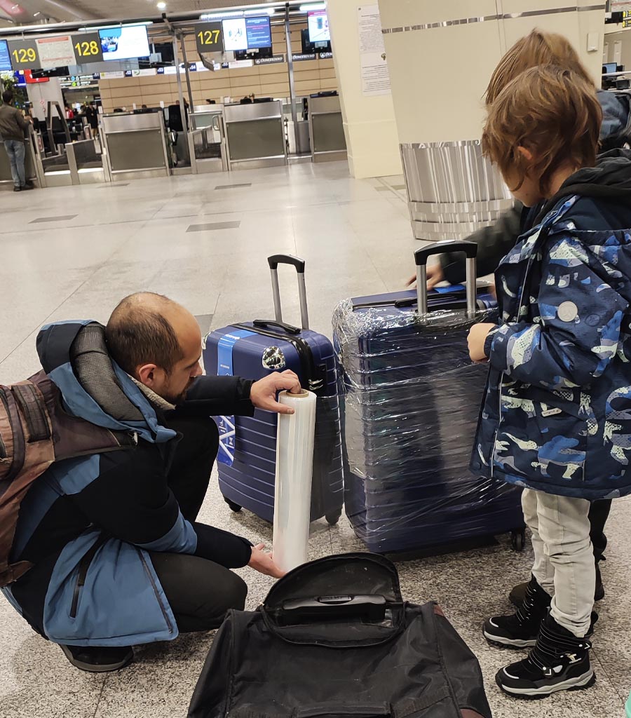 Паренёк поспешил на подмогу, а когда закончили, то и ему мы обмотали багаж. Остатки рулона еле-еле запихнули в старую сумку.