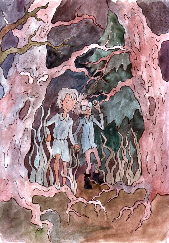 Перед ними встал, как ограда, лес. Деревья сомкнулись до самого неба и сплели свои ветви так, что между ними не видно было хоть сколько-нибудь слабого просвета. Но Тасю это не смутило. Она взяла дрожащего Чудоведа за руку и, отодвинув возмущенно скрипящие ветви, ступила в лес. Их окружила темнота. Идти оказалось непросто. Деревья были недовольны, что их потревожили. Они скрипели и кряхтели, их старые ветви кое-где сплелись так плотно, что Тасе то и дело приходилось сгибаться, чтобы пролезть сквозь узкую щель. А узловатые корни порой торчали прямо из земли, так что, перелезая через них, Чудовед каждый раз рисковал переломать и без того слабые ножки. Пробираясь между ветками, Тася услышала хруст разрываемой материи: сук подцепил и разодрал подол ее платья.