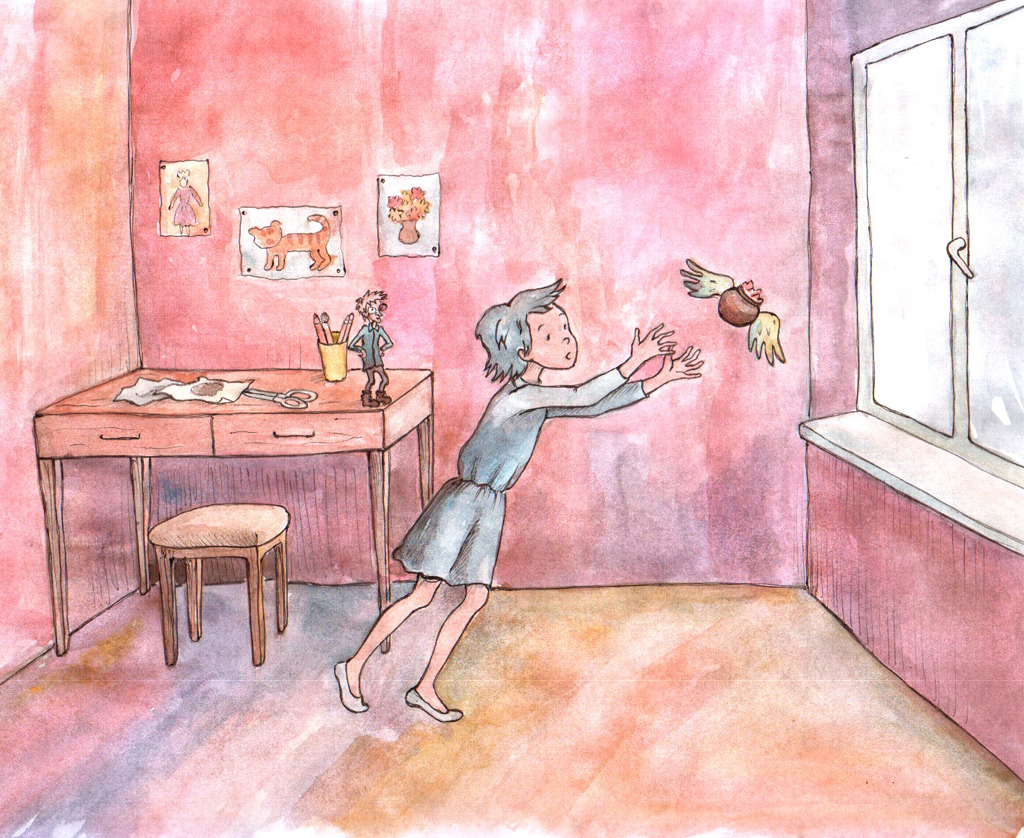 Тася взяла еще один лист бумаги, повозилась с ним, и вот в ее руках затрепетали два белых крылышка. Она достала баночку клея и приладила крылышки, которые все норовили разлететься в разные стороны, к бокам горшочка. Он тут же взмыл в воздух и стал кружить по комнате, то и дело врезаясь в стены.
