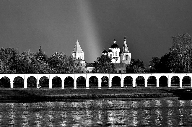 На правом берегу Волхова, напротив кремля – Ярославово дворище и Торг. В прошлом – княжеская резиденция, гостиный двор и место собрания «альтернативного веча». Ныне – хорошо сохранившийся уголок старины: семь средневековых храмов на одном пятачке, визуально объединенных построенной у береговой линии аркадой. Она появилась лишь в конце XVIII века, но удачно «вписалась», подчеркнула общность древних церквей. Из приходских храмов Новгорода обязательно нужно увидеть Спаса на Ильине улице (а внутри – уникальные росписи Феофана Грека), древнейшую, XII века храм Петра и Павла на Синичьей горе, его «тезку» – Петра и Павла в Кожевниках, храмы Спаса на Ковалеве и Спаса на Нередице. И это только самое-самое! А новгородские монастыри? В прежние времена город буквально обрастал ими; они, как и в Москве, играли роль сторожей, взявших Новгород в защитное кольцо. Древний Антониев, основанный в самом начале XII века Антонием Римлянином – трехглавый собор этой обители числится среди жемчужин новгородской архитектурной школы; видный Хутынский, где нашел упокоение великий русский поэт Г.Р. Державин; яркий и расписной Вяжищский, что в окрестностях Новгорода… А как не упомянуть еще одно архитектурное сокровище – Юрьев монастырь, на южной окраине города? Георгиевский собор XII века, тоже трехглавый – одна из вершин архитектуры не только местной, но и общерусской. Без упоминания этого грандиозного сооружения не обходится ни один обзор древнего нашего зодчества! А раз уж прибыли в Юрьев – грех не заехать и в соседние Витославицы, посетить один из лучших в России музеев деревянного зодчества, увидеть непарадную, сельскую сторону жизни Новгородской земли… Нет, решительно, Новгород – не из тех городов, в которые можно «заглянуть ненадолго». Столицу Русского Севера нужно постигать неспешно, в ритме жизни средневекового города, и вдумчиво, как опытный исследователь.