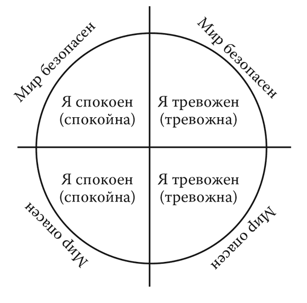 Оценка настоящего момента в контексте его безопасности является существенным фактором в понимании собственной тревоги. Чтобы лучше понять это и получить возможность примерить на себя, хочу предложить читателю поработать с предложенной ниже схемой. Иногда я советую использовать ее своим клиентам. Хочу отметить, что эта схема не является универсальной, а уж тем более ее нельзя рассматривать как портрет личности. Она скорее демонстрирует своего рода слепок настоящего состояния. Схема выглядит так: