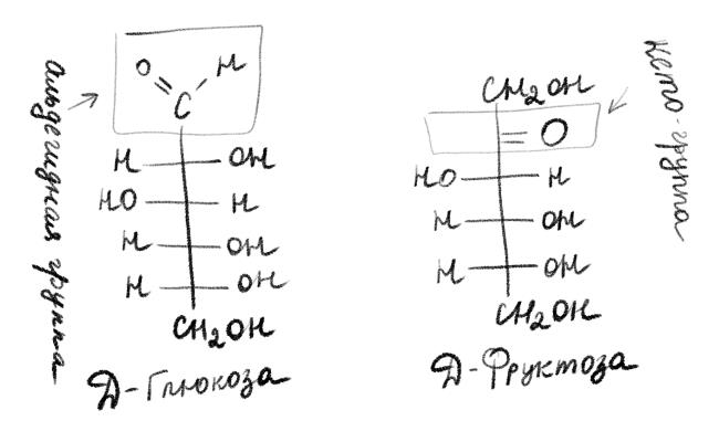 Рисунок 5. Глюкоза и фруктоза – изомеры. В первом случае есть альдегидная группа, а во втором – кето-группа. А набор атомов в обеих молекулах совершенно одинаковый