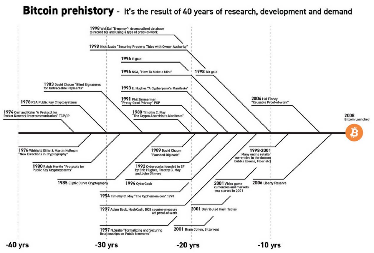 Рис. 3. Предыстория биткойна – это результат 40 лет исследований, разработок и потребности в его появлении.