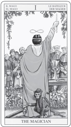 На первый план карты выходит обезьянка – верный помощник в ловких манипуляциях. Она символизирует ту часть психики Мага, которая способна провоцировать его на нечестные поступки. Ловкий и проворный зверек сейчас за спиной своего хозяина, но настойчиво дергает его за одежду, и тот прекрасно осведомлен о его существовании. Качества манипулятора, шулера, острый ум даны этому Магу от природы, заложены у него в бессознательном и проявляются порой инстинктивно.