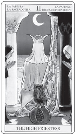 Женщина в светло-голубых одеждах, увенчанная двурогой диадемой, сидит меж двух колонн, белой и черной. Она смотрит на спокойную гладь моря. В небе сияет серп убывающей Луны. Завеса, отделяющая Жрицу от мистического храма, приоткрыта. У колонн молятся две монашки. Одна, в черном одеянии, стоит слева, возле белой колонны. Другая, в белом, – справа, возле черной. На переднем плане карты сова, сидя на разрезанном вдоль гранате, охраняет выход из храма.