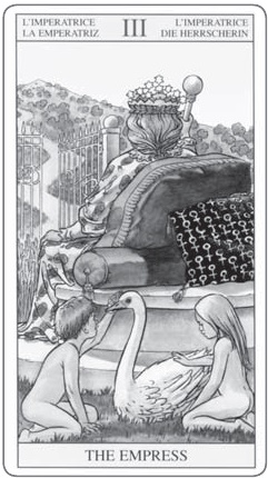 Женщина всматривается вдаль. Перед ней – поле созревшей пшеницы и открытые ворота сада, за которыми виден холм с поднимающейся по нему дорогой. За троном Императрицы, на переднем плане карты, обнаженные мальчик и девочка играют с лебедем.