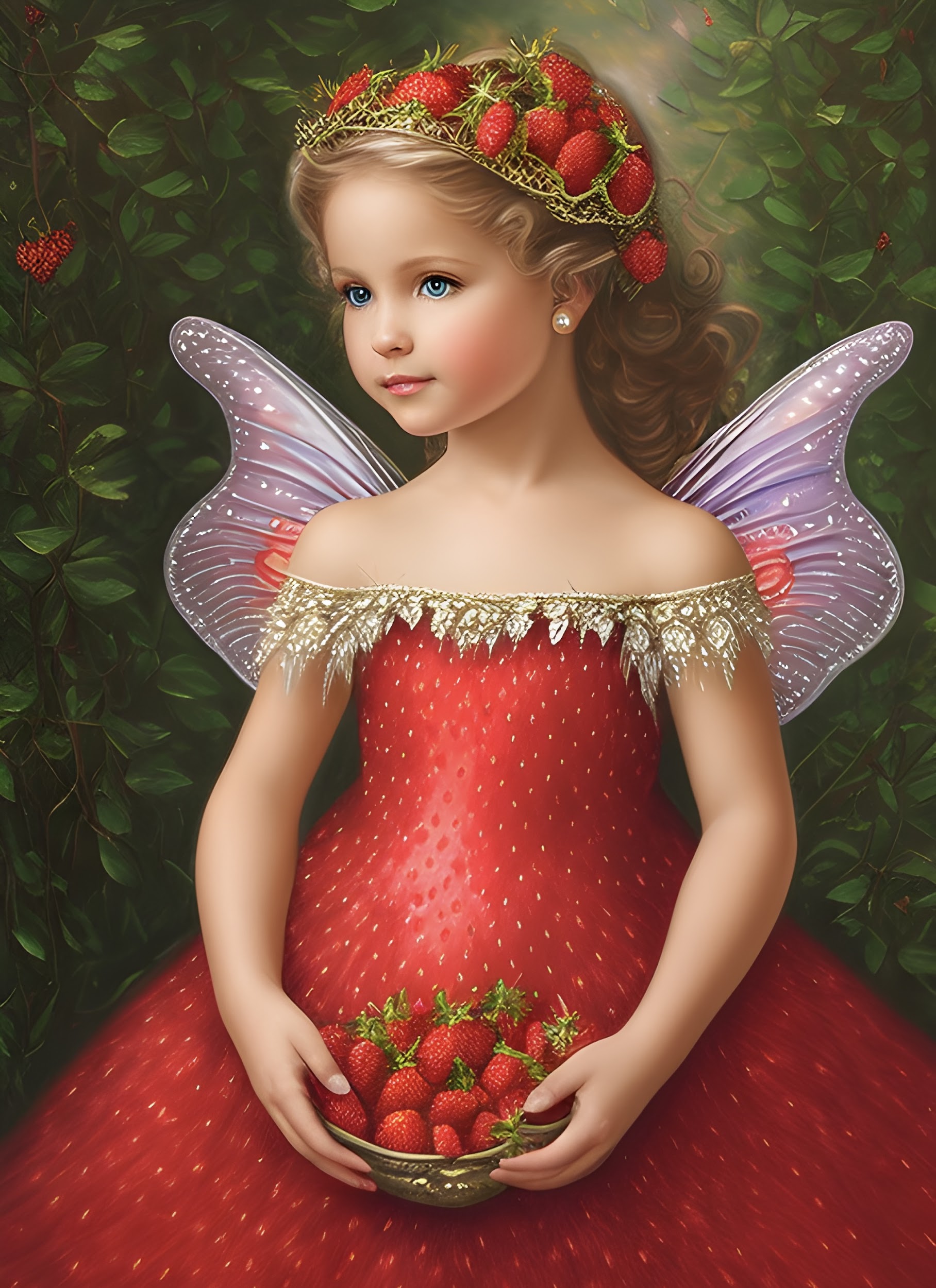 Алиса тут же раскрыла ладонь и не поверила своим глазам: на ней сидела, надув губки, крохотная девочка, очень похожая на клубничку. Ее платье было точь-в-точь похожим на ягодку. А спину украшали крылья невиданной красоты, почти как у бабочки, но прозрачные и искрящиеся светом.