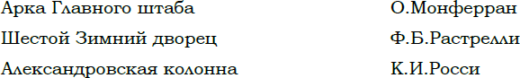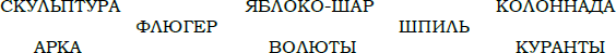 7. Вспомни, какими деталями украшены архитектурные постройки Дворцовой площади. Зачеркни в каждой строке лишнее слово.