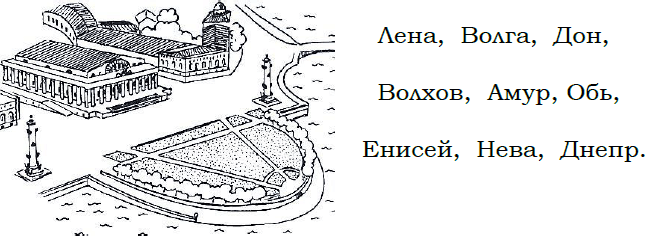 6. Раскрась Ростральные колонны красным цветом. Подчеркни названия великих рек России, скульптуры божеств которых установлены у подножия Ростральных колонн.