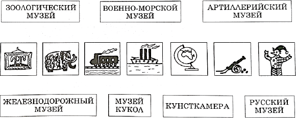 6. В Санкт-Петербурге множество музеев. Соедини линией картинку с подходящим названием музея. Какие из этих музеев расположены на Васильевском острове? Раскрась картинки этих музеев.