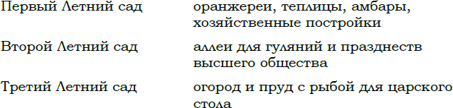 6. Во времена Петра I Летний сад делился на три части. Что находилось в каждой из этих частей? Соедини линией.