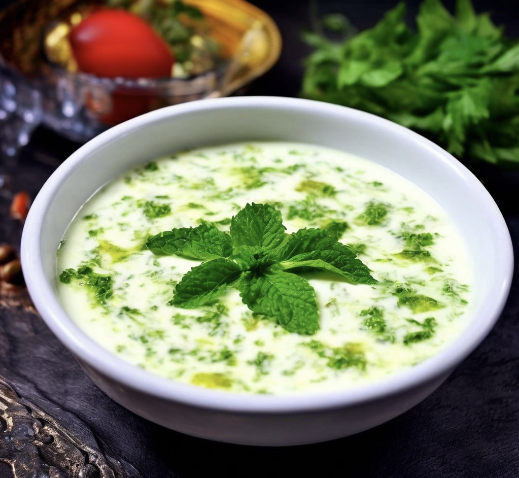 Перемешать, по вкусу добавить соль и перец и посыпать сушёной мятой.
