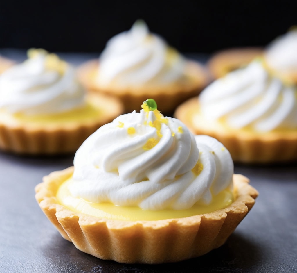 Выложите безе на тарталетки и подрумяньте в духовке при 200°C около 5 минут.