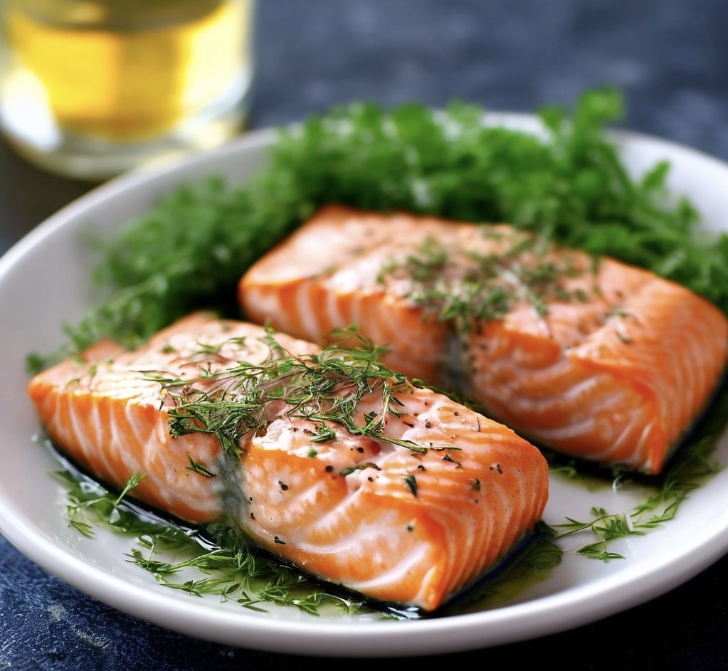 Стейки лосося посолите, поперчите и полейте оливковым маслом.