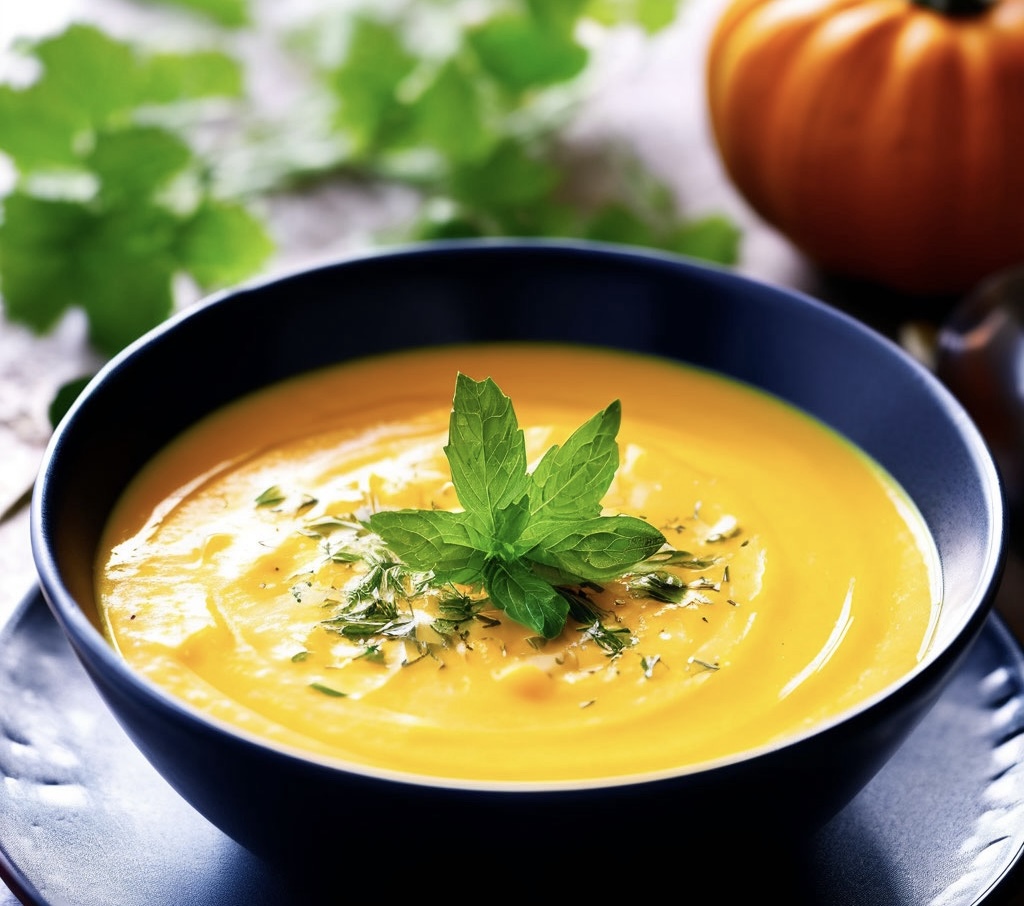 Добавить тыкву к луку и чесноку, залить овощным бульоном и варить 20 минут.