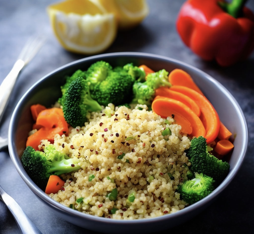Смешать киноа с овощами, заправить лимонным соком, солью и перцем.