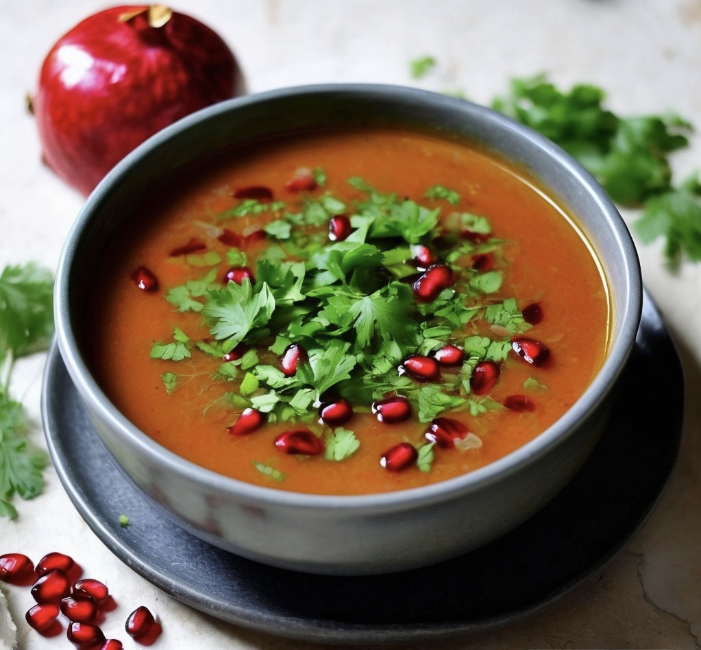 Это традиционный грузинский суп, который приготавливается с использованием кинзы (кориандра) и гранатового сока.