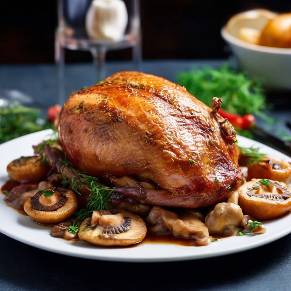 Подавайте фаршированную утку на большой тарелке с гарниром по вашему выбору, например, картофельным пюре или овощным салатом.