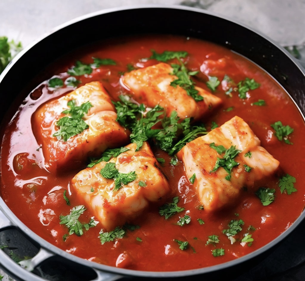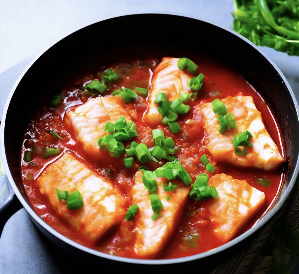 Если вы хотите более острое блюдо, добавьте красный перец. Положите нарезанные куски рыбы в сковороду и дайте им вариться в томатном соусе на среднем огне около 5—7 минут, или до тех пор, пока рыба не станет нежной и приготовится.