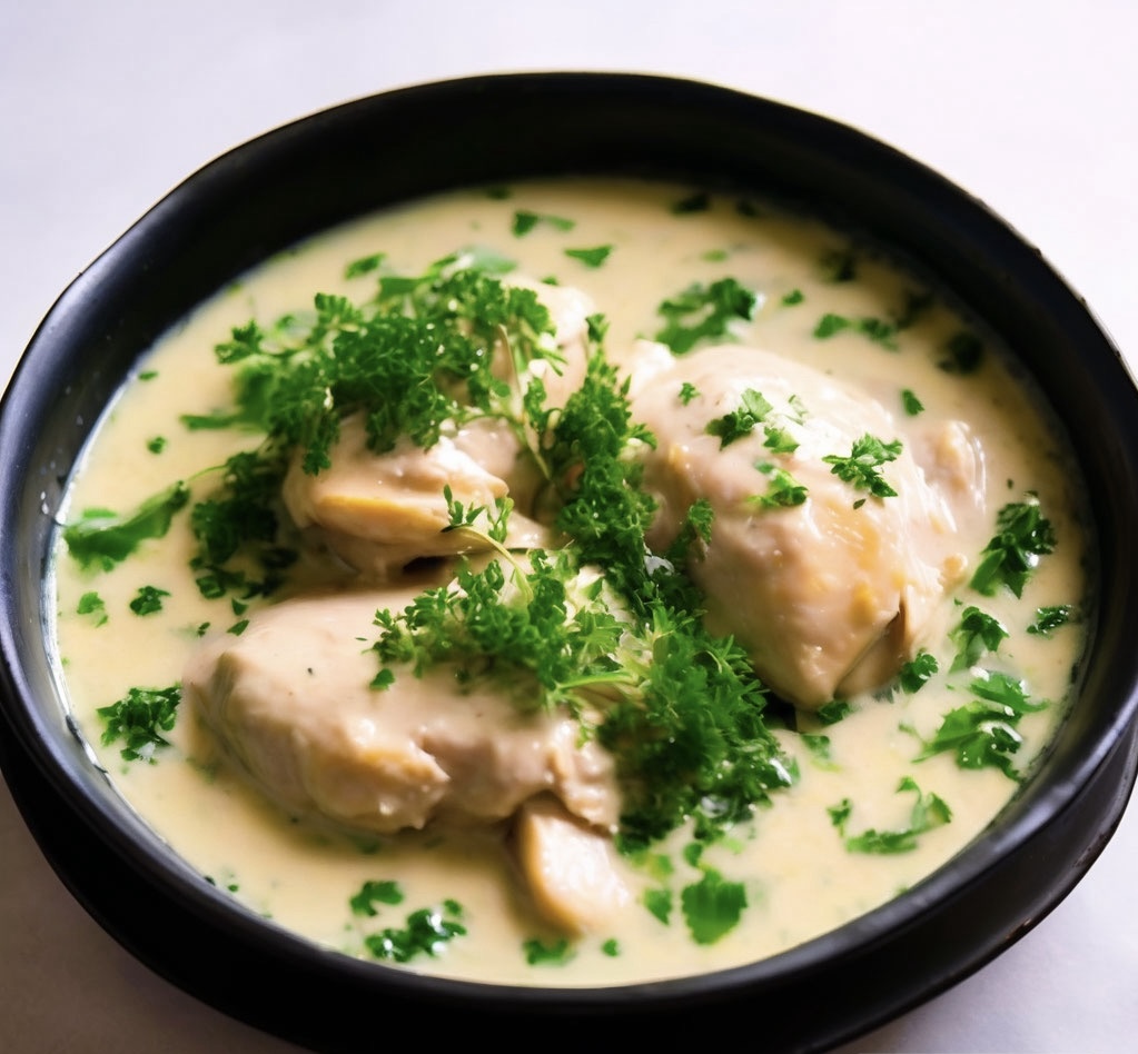 После приготовления куриного фрикасе подавайте его на стол, украсив зеленью.