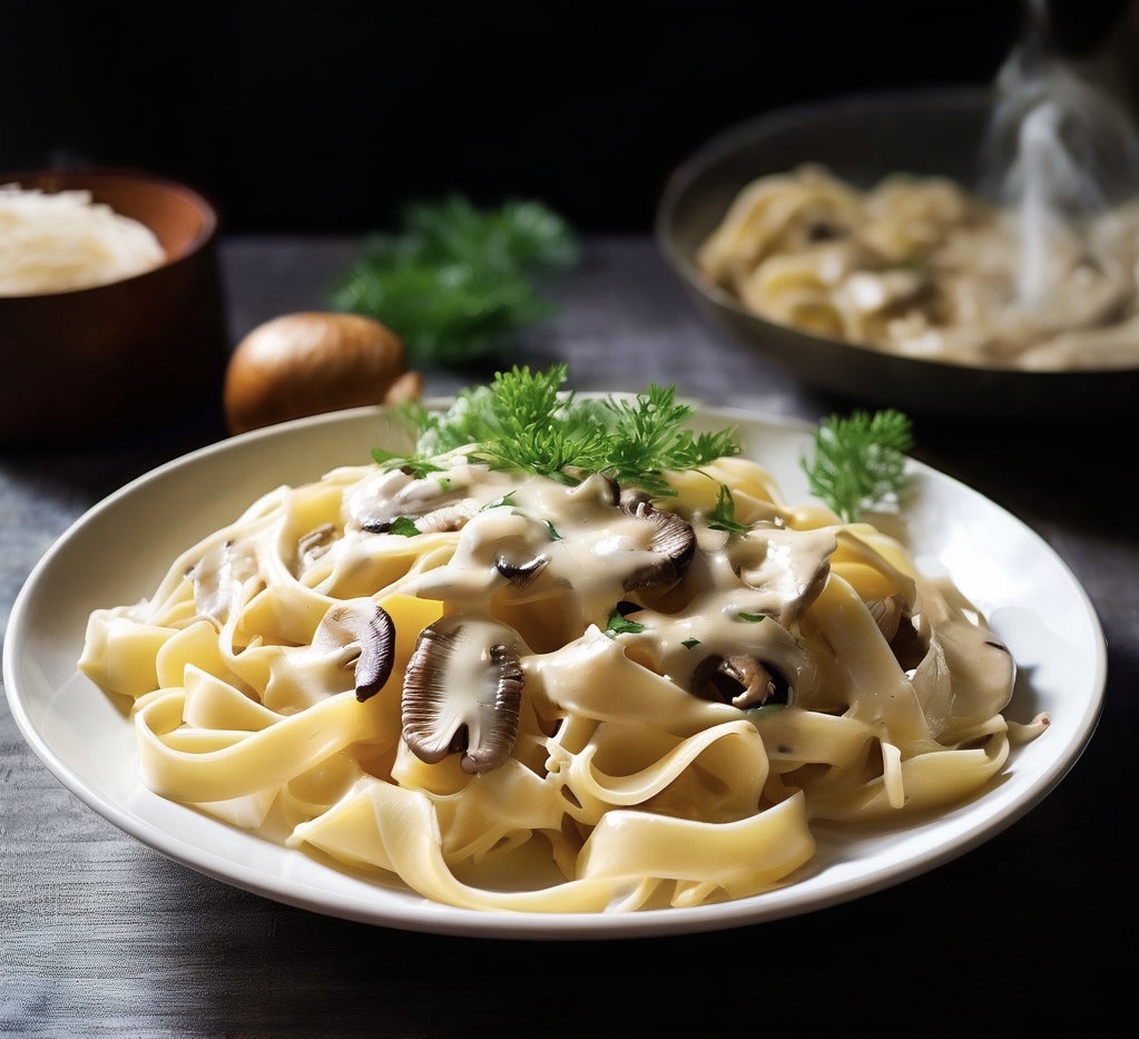 Подаём пасту с вешенками горячей, посыпав свежей нарезанной петрушкой.