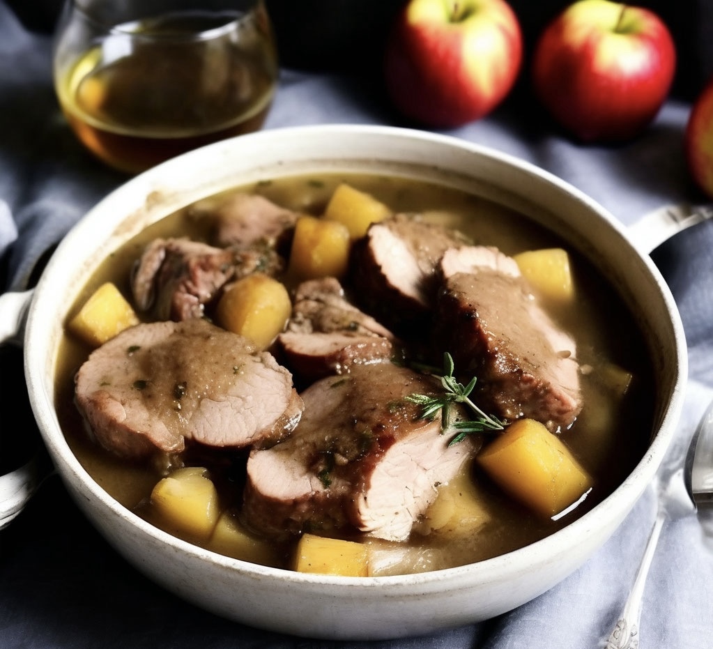 Подавайте свиную вырезку с яблочным сидром горячей, с картофельным пюре или отварным рисом.