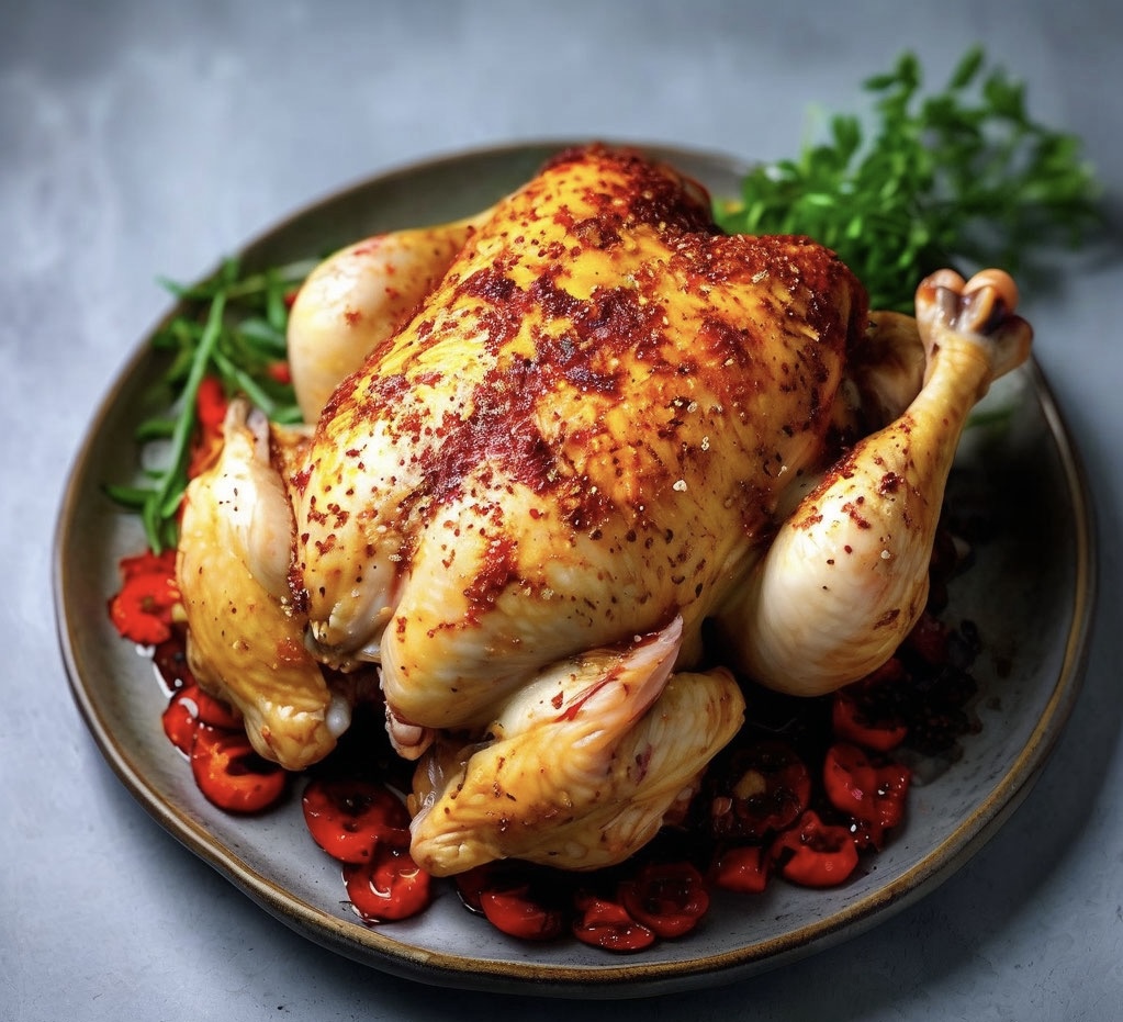 Периодически поливайте курицу собственными соками, чтобы она оставалась сочной.