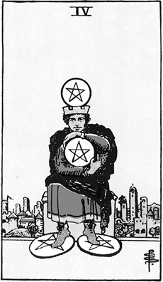 Рис. 15. Четверка монет (Младший аркан Таро). Колода Райдера-Уэйта-Смит