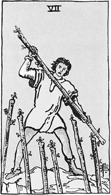 Рис. 16. Семерка жезлов (Младший аркан Таро). Колода Райдера-Уэйта-Смит