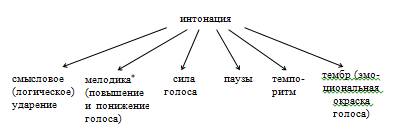 Интонация – сложное языковое явление. Включает в себя логическое ударение, мелодику, силу голоса, темпо-ритм, паузы, тембр. Это важнейшее средство выразительности устной речи, средство передачи чувств. От интонации может зависеть смысл высказывания.