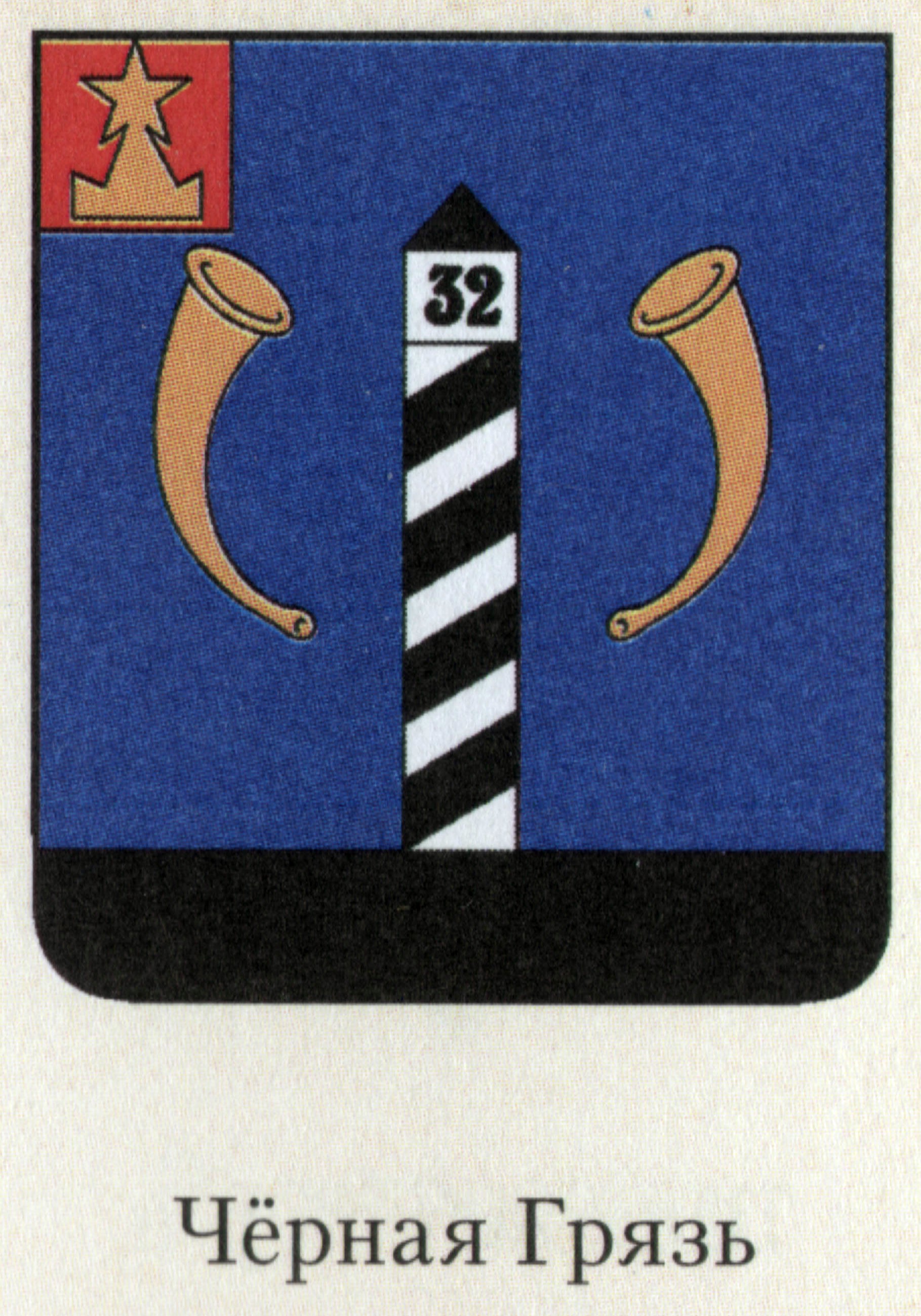 Деревня Черная Грязь расположена на 32 км Ленинградского шоссе, что отражено в гербе этой деревни. Старинный верстовой столб напоминает, что через деревню пролегал тракт Москва – Петербург. Два почтовых рожка символизируют находящуюся в деревне почтово-ямскую станцию.