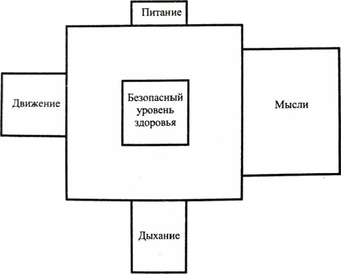 Теперь становится понятно, что дисциплина мыслей позволяет направлять их вверх, в сторону созидания. Для этого в вашем теле должно быть достаточно энергии. Ее человек получает при дыхании, движении и правильном питании. Если сложить все четыре составляющие, получим квадрат здоровья, который изображен на рис. 4.