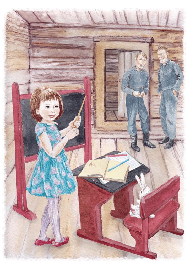 Для того чтобы её сделать, папа вместе со столяром дядей Толей две недели каждый день задерживались после работы на два-три часа. Им даже пришлось сходить в настоящую школу, чтобы замерить парты. Сделав парту, они покрыли изделие лаком. Пока лак высыхал, мужчины смастерили ещё и маленькую классную доску, покрасив её коричневой краской. Доска была на подставке, и её легко можно было переставлять куда угодно. В придачу ко всему дядя Толя из дерева изготовил маленькую указку и украсил её резными узорами. А папа где-то достал целую коробку белого мела.