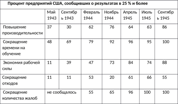 Общие результаты внедрения программ TWI были зафиксированы в разных отраслях промышленности. По данным отчетов, с 1943 по 1945 год количество предприятий, получивших результаты в 25% и более, росло с каждым годом5.