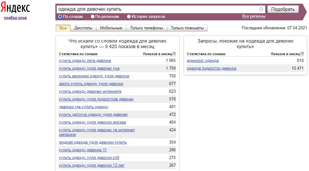 Чтобы проанализировать спрос на продукт, который вы собираетесь предлагать, можно воспользоваться сервисом Wordstat2. Вы вбиваете в строку запрос, связанный с покупкой этого товара, во вкладке «По словам». Например, «одежда для девочек купить» (рис. 1). Здесь вы видите количество таких запросов в «Яндексе» за месяц. Можно в разделе «Все регионы» указать отдельно взятый регион или город и узнать количество запросов по ним. Если вы перейдете на вкладку «История запросов», то сможете узнать динамику спроса за два года. Увидев эти цифры, вы примерно оцените долю рынка и примите решение: 1. стоит ли этим заниматься (есть ли необходимый спрос); 2. в какие регионы нужно продавать.