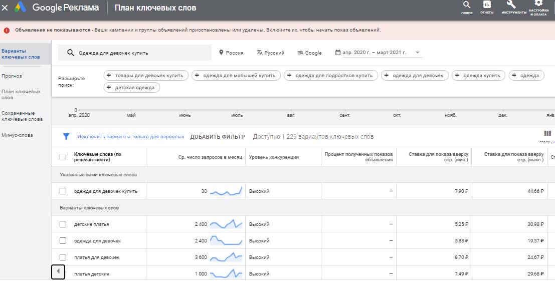 Рисунок 2. Планировщик ключевых слов
