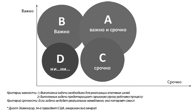 А (важных и срочных) – подготовка к сегодняшнему совещанию у руководства, В (важных, но не срочных) – подготовка к совету директоров через месяц,