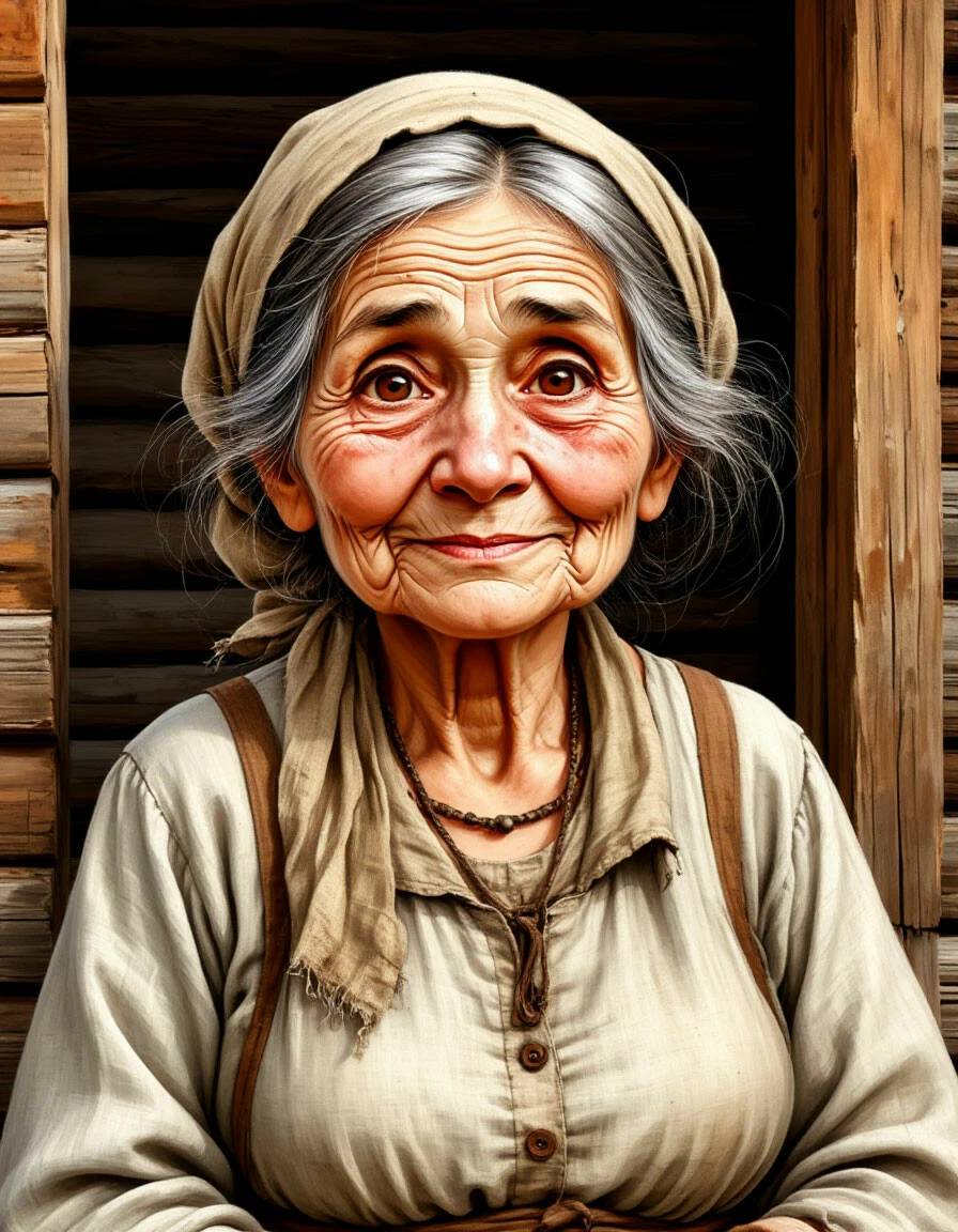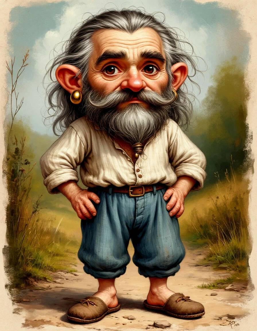 Я аж подпрыгнула. Из кухни к нам вышел маленький, коренастый, мужичок. Низенький, в льняной рубахе, широких синих хлопковых штанах и войлочных тапках на босу ногу. Волосы длинные мышино – серого цвета, заплетены в косу. Широкие кустистые брови, борода до пояса, аккуратно причесанная, усы гусарские пышные – длинные, завитые. Глаза большие, черные. Нос картошкой, а в ухе правом серьга цыганская, золотая, пузатая и круглая. Ростом он мне доходил лишь до солнечного сплетения. Наверно не выше 120 сантиметров. Голос глубокий, грубоватый.