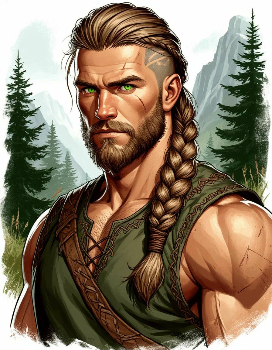 Высокий, широкоплечий, и немного неуклюжий. В отличной физической форме, на вскидку дала бы ему лет 26- 28. Но судя по бабушке, уже сомневаюсь. Он же улыбнувшись в ответ, подмигнул своим зеленущим глазом. Вот не замечала раньше такой яркой зелени в его глазах. Словно молодая , весенняя трава пробивается из глубины его больших глаз. Волосы снова были забраны в толстую косу, а на лбу берестяной обруч. Интересный парень.