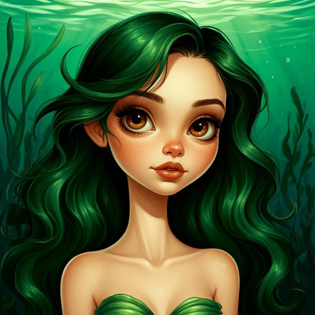 Берег реки был песчаный, ровный, поток тоже был не сильный, всегда легко справлялась с лодкой. До воды оставалось метров 10, когда из под воды показалась зеленоволосая макушка, молодой девушки. Увидав бабушку, она резво выбралась на берег и радостно замахала своей перепончатой рукой. Ниже пояса у нее был чешуйчатый хвост, грудь прикрывала короткая сорочка сплетенная и разноцветных лент.