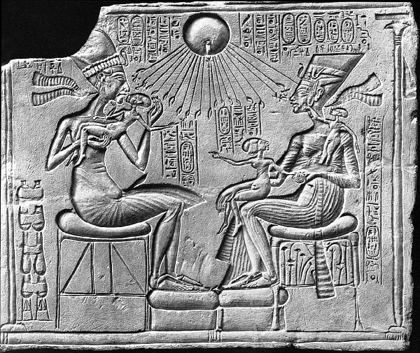 Фараон Эхнатон и Нефертити с детьми в лучах бога Атона.