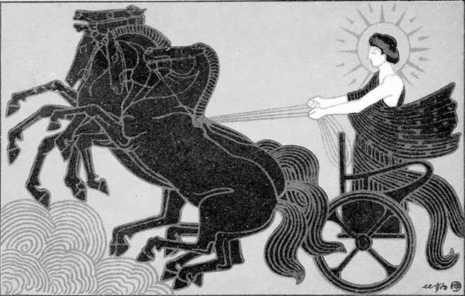 На четверке крылатых коней в золотой колеснице, которую выковал бог Гефест, выезжает на небо с берегов океана лучезарный бог. Верхи гор озаряют лучи восходящего солнца, и они высятся, как бы залитые огнем. Звезды бегут с небосклона при виде бога Солнца, одна за другой скрываются они в лоне темной ночи. Все выше подымается колесница Гелиоса. В лучезарном венце и в длинной сверкающей одежде идет он по небу и льет свои живительные лучи на землю, дает ей свет, тепло и жизнь.
