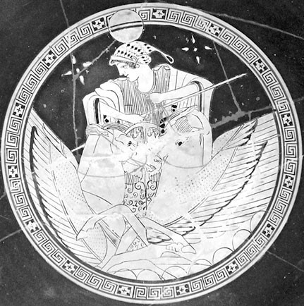 Селена – богиня Луны – на колеснице, запряженной крылатыми лошадьми. Роспись на дне краснофигурного килика Брига. 490 – 480 гг. до н.э.