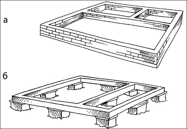Рисунок 1. Виды фундамента: а – ленточный; б – свайный, или столбчатый