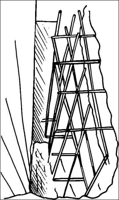 По всему периметру здания прокладывают ров глубиной, превышающей глубину залегания старого фундамента (т. е. дно рва должно находиться немного ниже подошвы старого основания дома). Ширина дополнительного фундамента должна быть не меньше ширины старого. Иногда ее делают в полтора-два раза больше. Затем старый фундамент подготавливают к соединению с дополнительным. Для этого в массиве старого фундамента с помощью перфоратора бурят отверстия для штырей арматуры. В качестве штырей можно использовать отрезки металлического прута, длиной равные сумме ширины старого фундамента и дополнительного. Чем больше вставить таких штырей, тем крепче будет сцепка фундаментов. После этого укрепляют стену рва деревянной опалубкой, а затем делают арматурный каркас и сцепляют его со штырями, вставленными в старый фундамент (рис. 5). Когда арматура будет готова, ров заливают раствором бетона. Засыпать ров можно только после того, как бетон полностью высохнет.