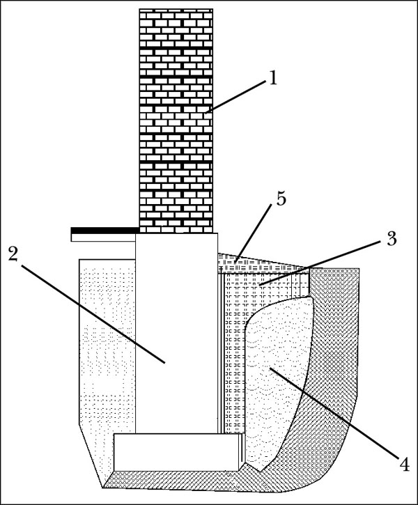 Рисунок 6. Утепление фундамента: 1 – стена; 2 – фундамент; 3 —утеплитель; 4 – песок; 5 – отмостка