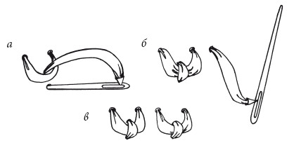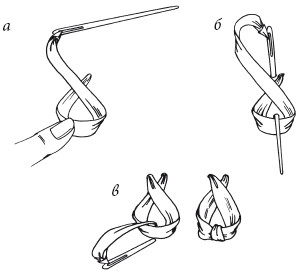 Иглу с лентой вытянуть на лицевую сторону и сделать прокол на изнаночную сторону. Иголку вывести налицо немного выше выхода ленты и завести ее за иголку (рис. 4а). Сделать петельку и закрепить ее маленькой прикрепкой (рис. 4б). Петелька с прикрепкой готова (рис. 4в).