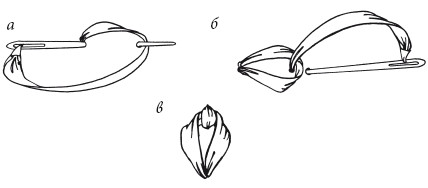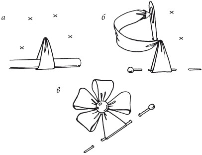 Этими стежками вышивают много разных цветков. Вытянуть иголку с лентой на лицевую сторону и сделать прокол очень близко с местом выхода ленты. Протянуть ее на изнаночную сторону. В образовавшуюся петельку вставить колышек или карандаш (рис. 3а). Затем вытащить иголку с лентой на лицевую сторону рядом с первой петелькой. Первую петельку закрепить булавкой, во вторую вставить колышек или карандаш. Сделать прокол на изнанку рядом с местом выхода (рис. 3б). Таким же образом выполнить все петельки по кругу (рис. 3в).