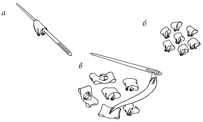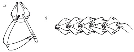Этот шов используется в различных видах вышивания. Вывести иголку с лентой на лицевую сторону и сделать прокол на изнанку в месте выхода ленты. Затем протянуть иголку с лентой на длину стежка на лицевой стороне внутри получившейся петельки (рис. 8а). Потом выполнить остальные петельки точно так же, как и первую. Должна получиться цепочка из петелек (рис. 8б).