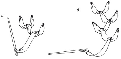 На лицевой стороне выполнить полупетельку с прикрепкой. Вытянуть иголку с лентой на лицевую сторону правее и немного ниже первой полупетельки и сделать вторую полупетельку с прикрепкой (рис. 7а). Следующую петельку выполнить слева от предыдущей. Четвертую – справа. Таким образом сделать полупетельки то справа, то слева поочередно (рис. 7б).